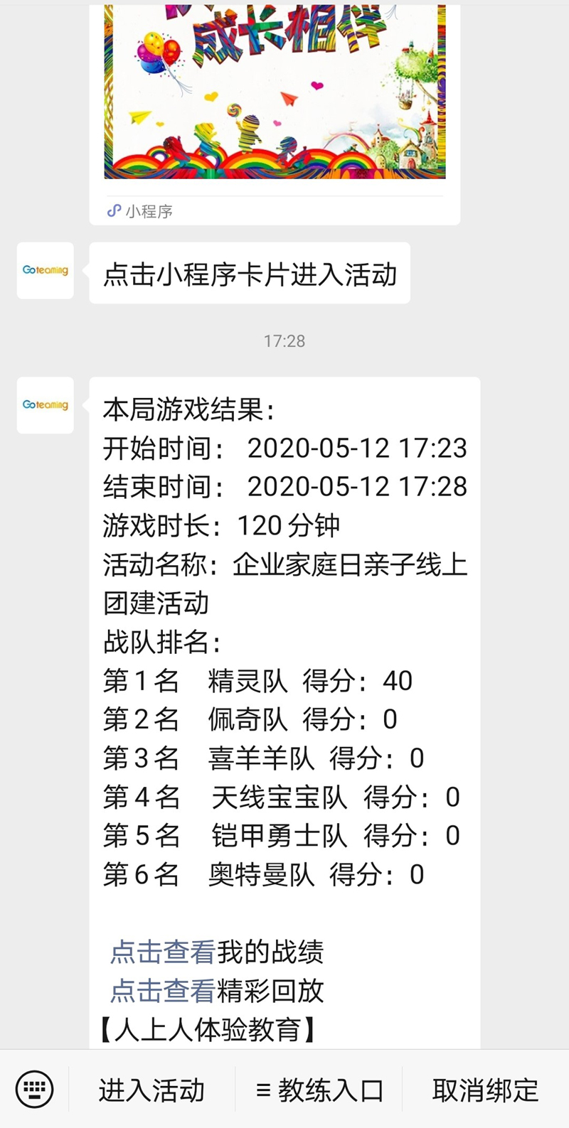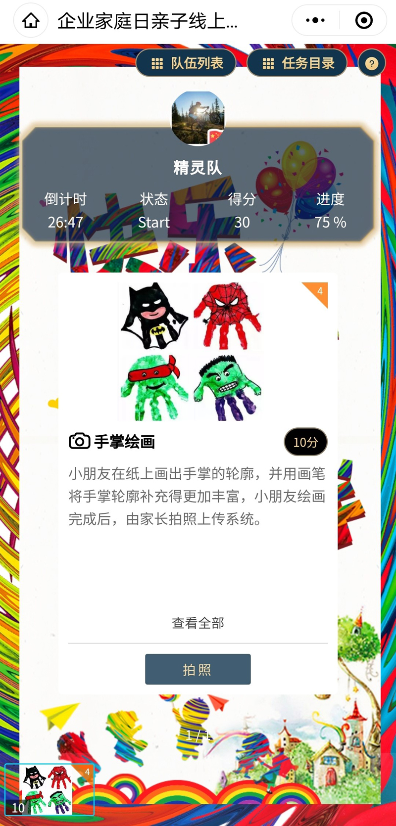 員工家庭日親子線上團(tuán)建活動(dòng),依托于微信智能小程序開發(fā)。從隨機(jī)分組、領(lǐng)取任務(wù)、挑戰(zhàn)、評判得分、即時(shí)排名均為智能操作,在當(dāng)前疫情的特殊時(shí)期,能保證大小伙伴們的安全,同時(shí)操作簡便,趣味不減。
