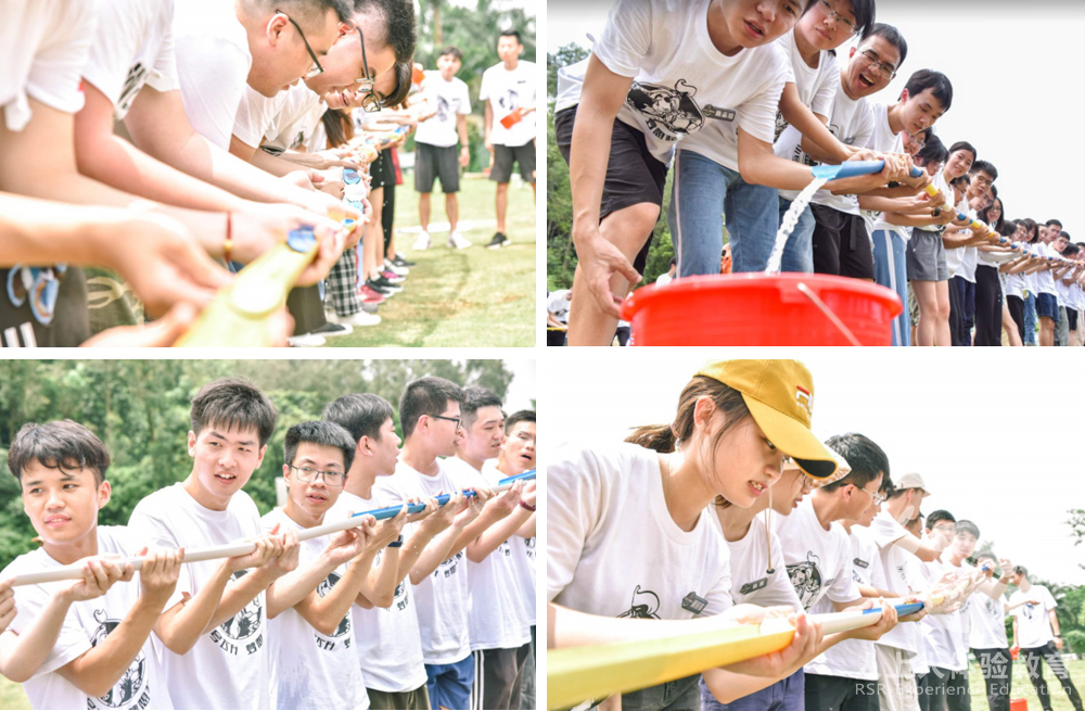 水資源是至關重要的,在沒有管道的基礎物料下,采集水資源,每人一根PVC管,團隊合作,接力的方式,將起點處的水運送至終點處。