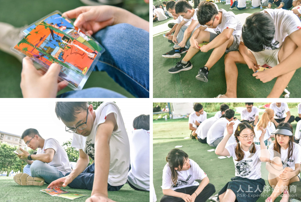每個隊伍的成員圍成一個圓圈,面向圓心,教練將30張牌平均放在他們的背后(可能會出現(xiàn)有人多一張的情況)學員要遵守一個原則:看圖不講話,講話不看圖??磮D時大家統(tǒng)一向后轉看自己面前的圖,不可以講話不可以交換圖卡。將自己對面前圖卡的信息整理總結,討論時面對圓心,不可以看圖。