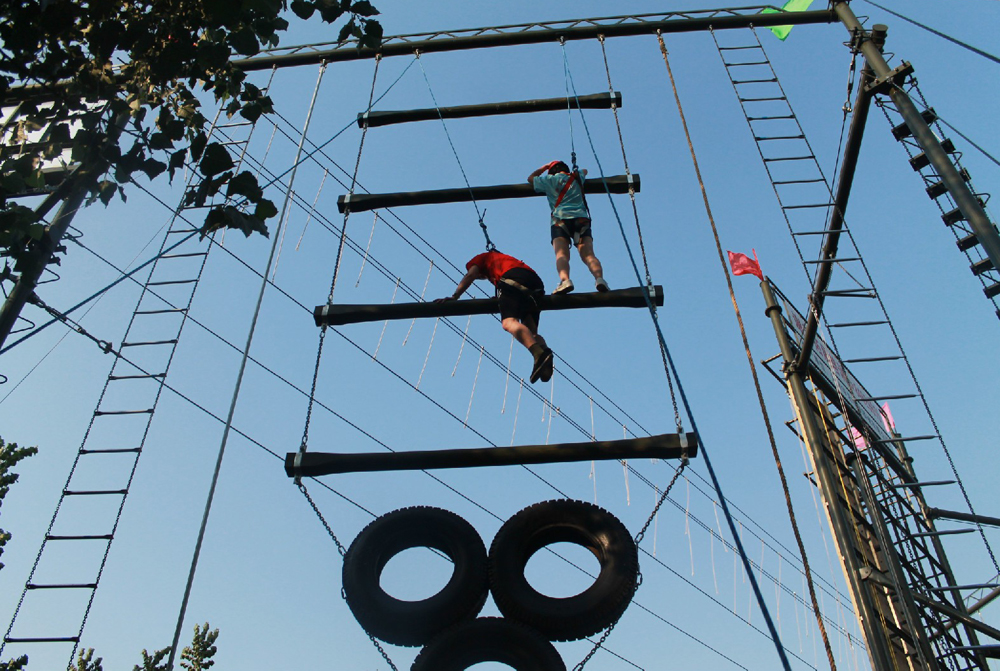 巨人梯又稱天梯、云梯,是一個強調(diào)團隊合作的高空項目。隊員以組為單位,沿著天梯盡力向上爬,所有隊員都腳踩第五根,手扶第六根時,項目成功。