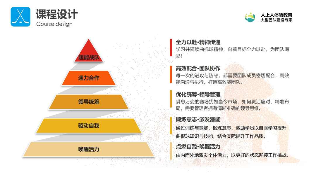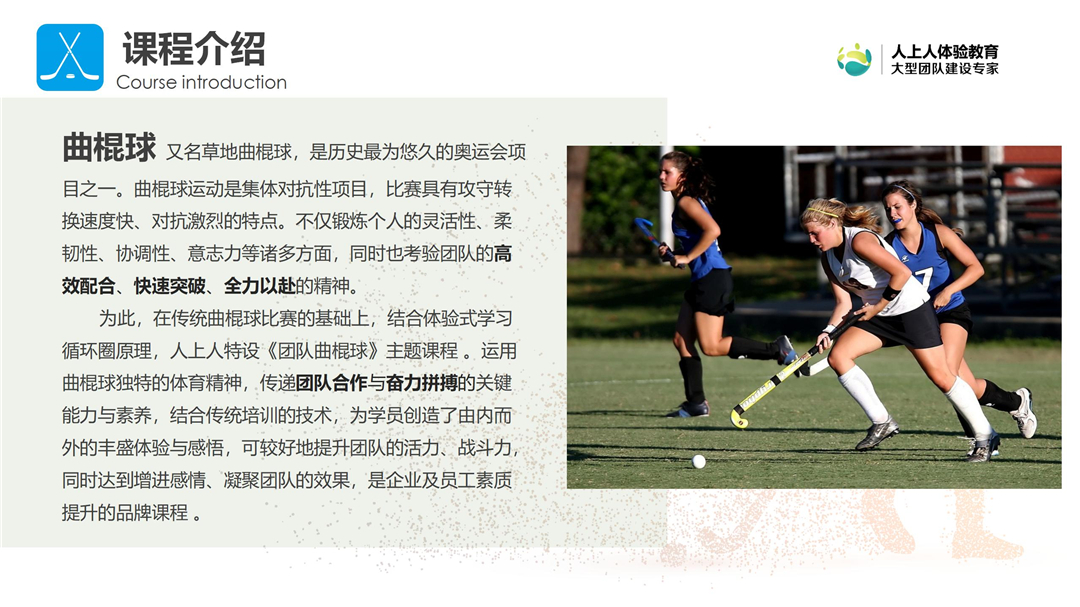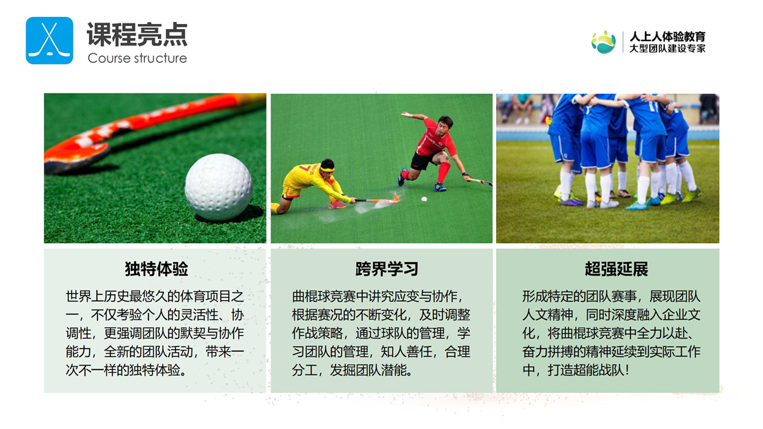 曲棍球,又名草地曲棍球,是歷史最為悠久的奧運(yùn)會(huì)項(xiàng)目之一。 《團(tuán)隊(duì)曲棍球》是在傳統(tǒng)曲棍球比賽的基礎(chǔ)上,結(jié)合經(jīng)典團(tuán)建設(shè)計(jì)思路而推出的團(tuán)建課程,在激情運(yùn)動(dòng)中引導(dǎo)學(xué)員和團(tuán)隊(duì),從而達(dá)到增進(jìn)感情、凝聚團(tuán)隊(duì)的效果,是企業(yè)員工素質(zhì)提升的品牌課程。
