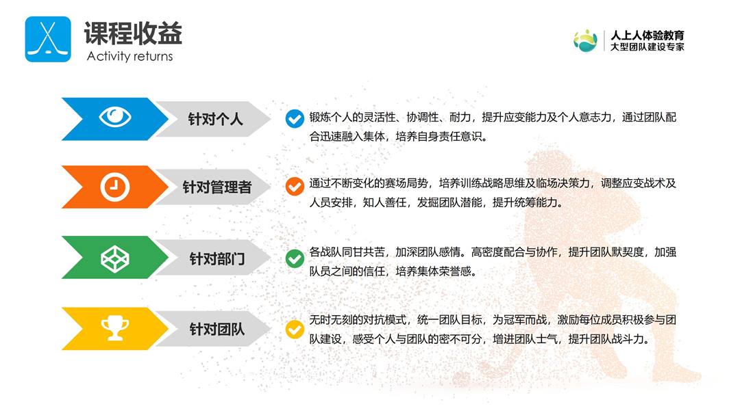 2、培養(yǎng)團(tuán)隊(duì)的高效配合、快速突破、全力以赴的綜合能力。