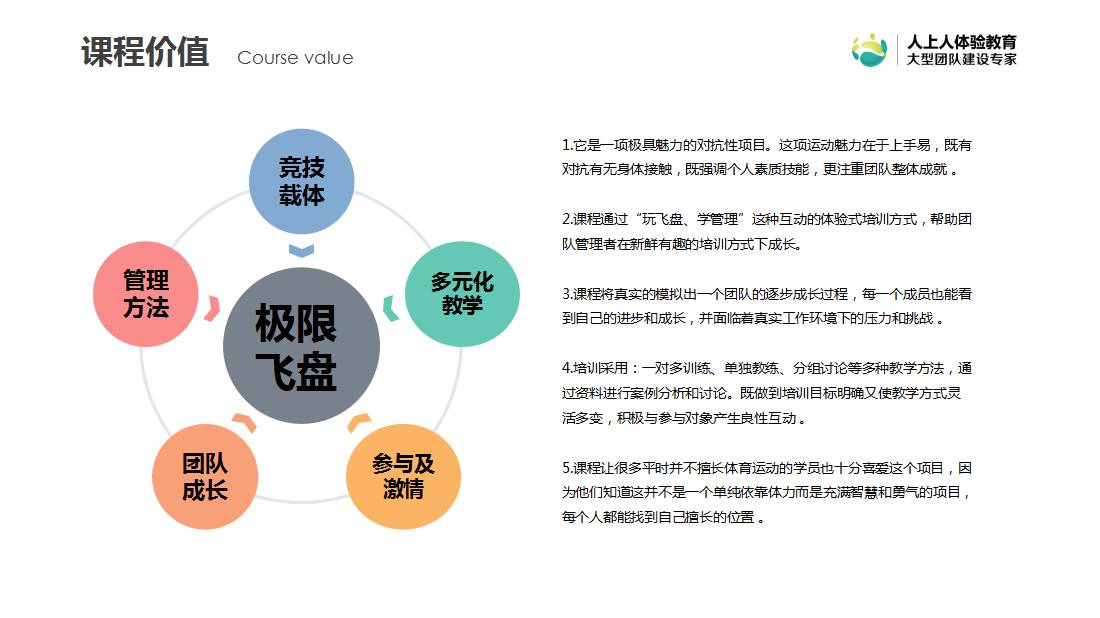 很多人喜歡極限飛盤,不僅是追求運(yùn)動(dòng)的競(jìng)技性,更多是因?yàn)?ldquo;飛盤精神”——相互尊重、相互信任。課程以飛盤運(yùn)動(dòng)為載體,真實(shí)模擬組織構(gòu)成,通過角色分工,緊密合作,活力展現(xiàn)團(tuán)隊(duì)力量。