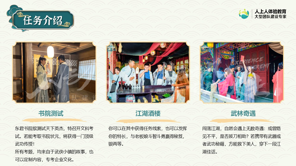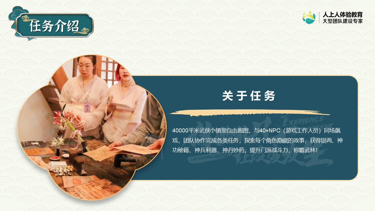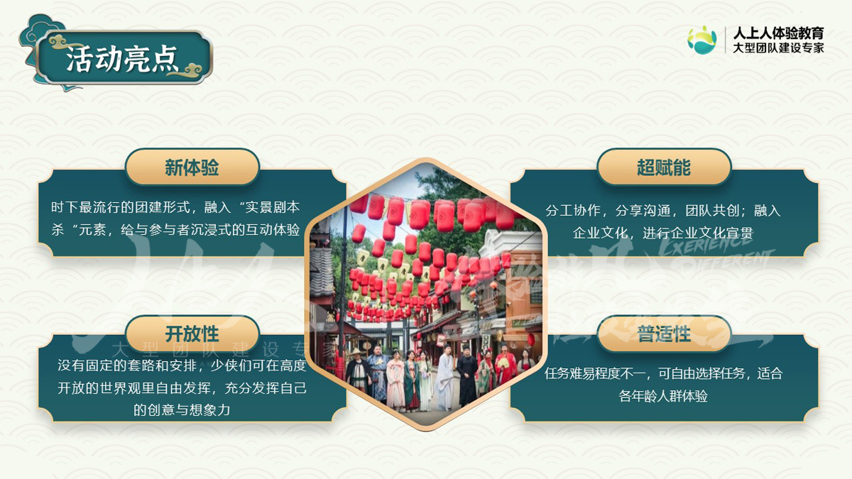 1、新體驗(yàn):時(shí)下最流行的團(tuán)建形式,融入“實(shí)景劇本殺“元素,給與參與者沉浸式的互動(dòng)體驗(yàn)