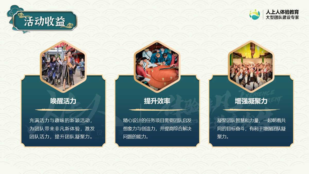 1、喚醒活力:充滿(mǎn)活力與趣味的新穎活動(dòng),為團(tuán)隊(duì)帶來(lái)非凡新體驗(yàn),激發(fā)團(tuán)隊(duì)活力,提升團(tuán)隊(duì)凝聚力。