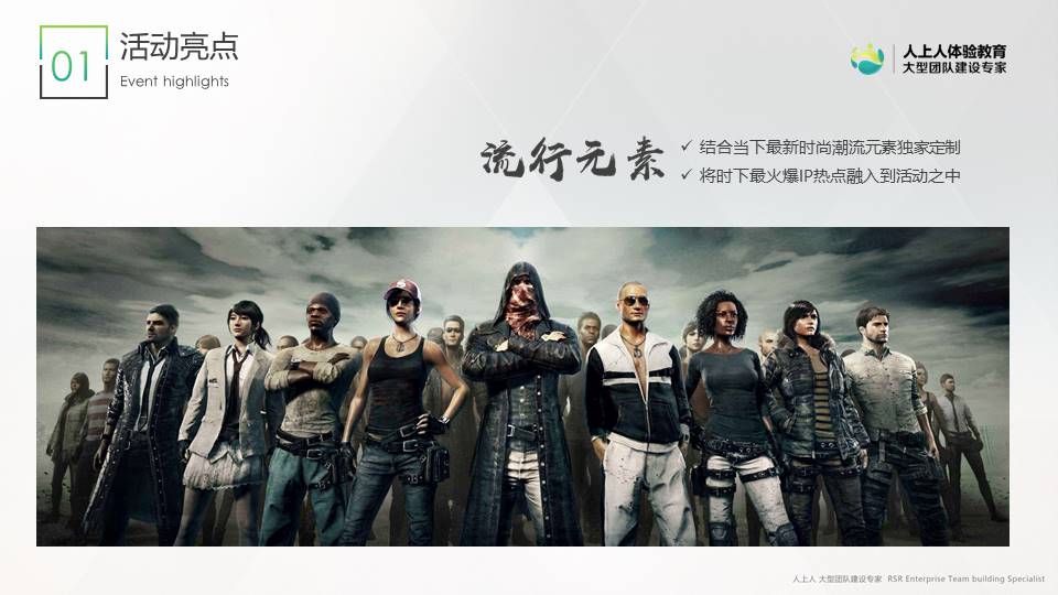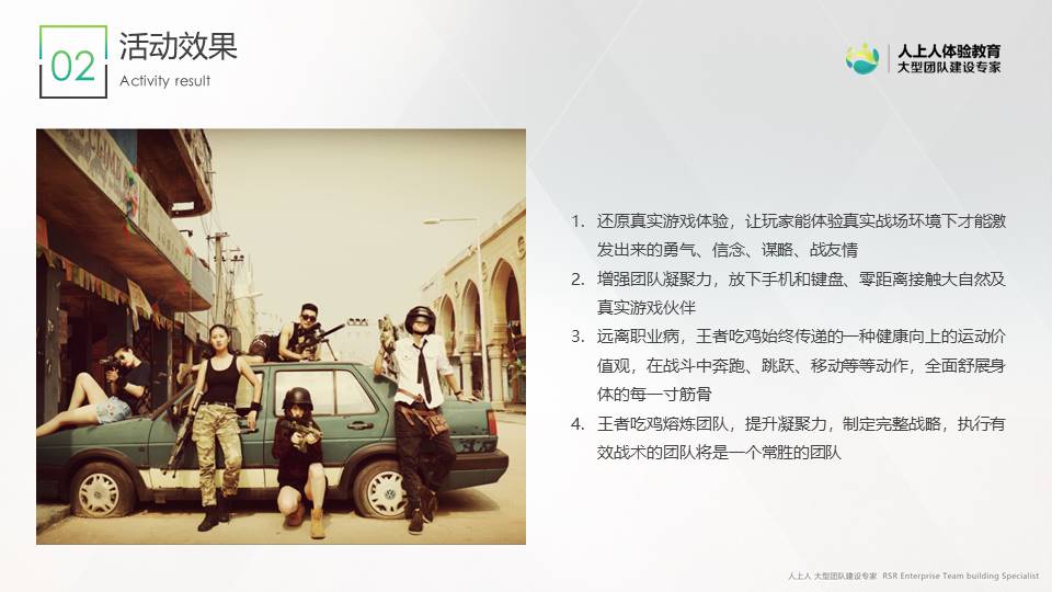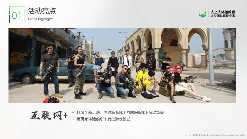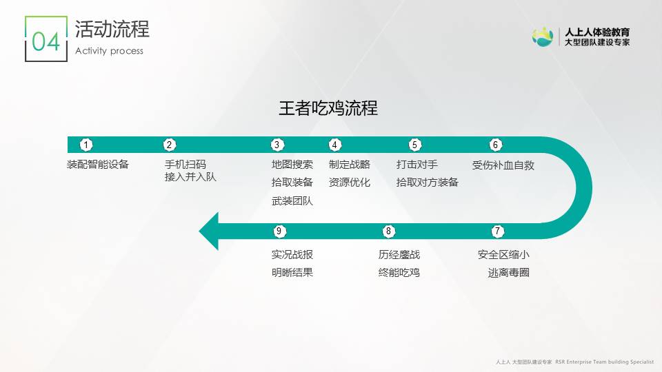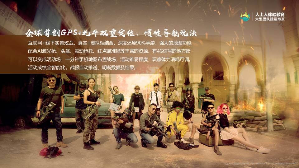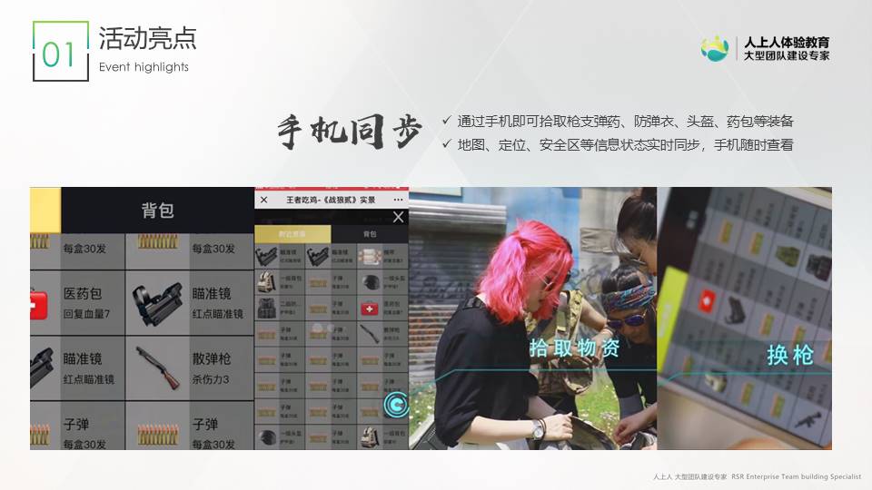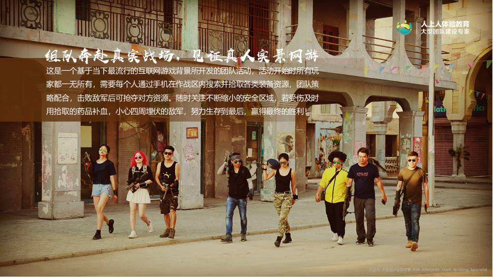 這是一個基于當下最流行的互聯(lián)網(wǎng)游戲背景所開發(fā)的團隊活動。活動開始時所有玩家都一無所有,需要每個人通過手機在作戰(zhàn)區(qū)內(nèi)搜索并拾取各類裝備資源。通過團隊策略配合,擊敗敵軍后可搶奪對方資源。學員需要隨時關注不斷縮小的安全區(qū)域,若受傷及時用拾取的藥品補血,小心四周埋伏的敵軍。努力生存到最后的隊伍,贏得最終的勝利!